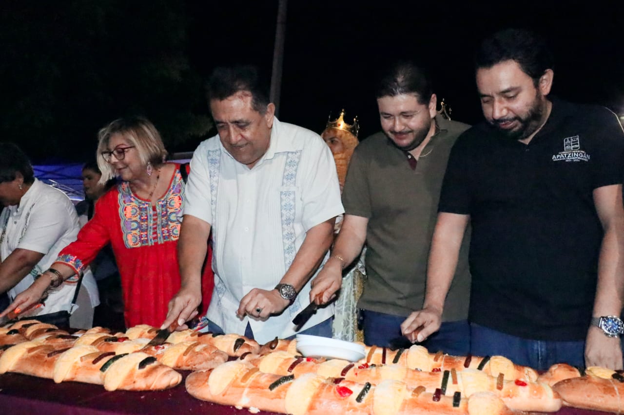 Apatzingán, Mich. 6 de Enero del 2024. Cientos de familias celebraron el Día de Reyes a un costado del Teatro Constitución, donde el presidente municipal, José Luis Cruz Lucatero y la presidenta del DIF, Minerva Guízar Brito, cortaron la tradicional rosca de 100 metros y 150 litros de chocolate y avena, además se repartieron juguetes a niños y niñas de colonias y comunidades.